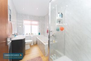 Side aspect obscure window. Fitted in a four piece suite comprising low level WC, wash hand basin, bath and separate shower enclosure.
