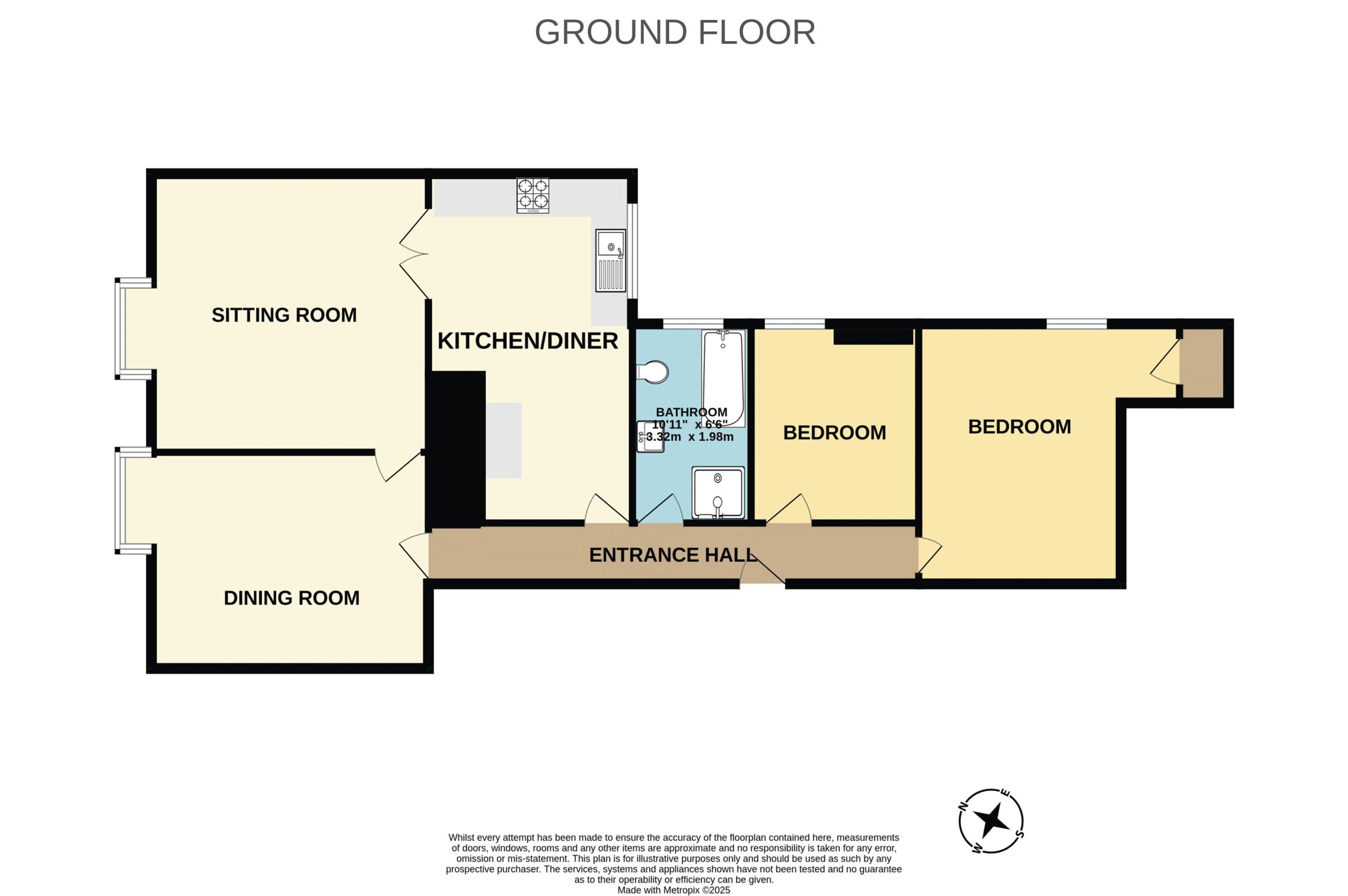 Doors to dining room, kitchen, bathroom and two bedrooms. High level electric fuse board and hatch to loft.