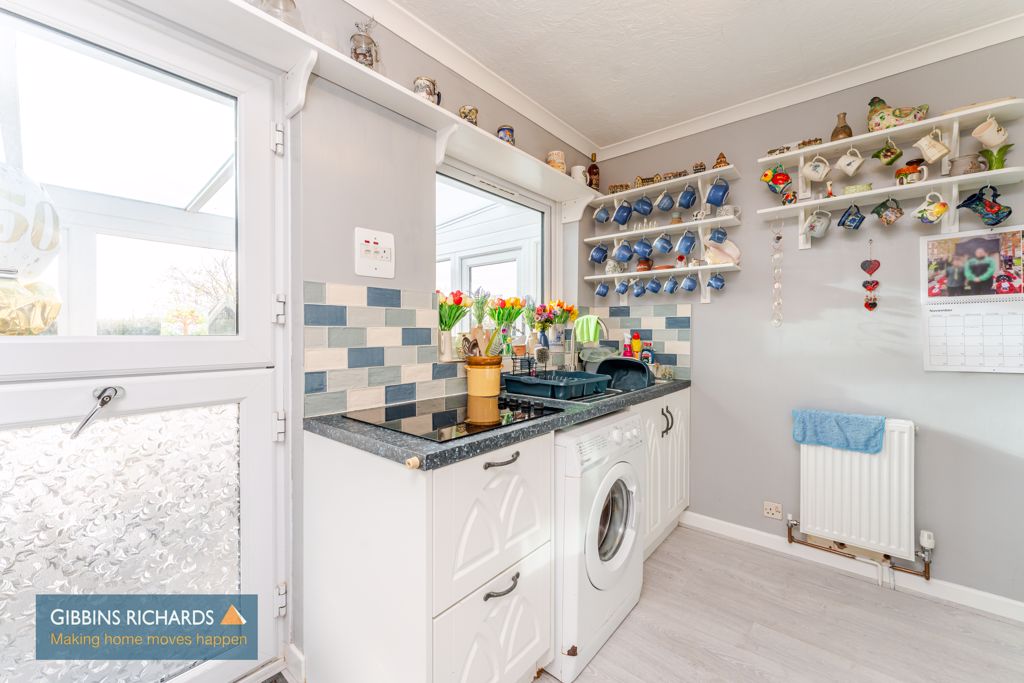 Built-in double oven, ceramic hob, plumbing for washing machine, space for upright fridge/freezer, door to;