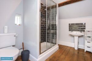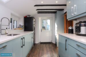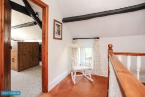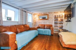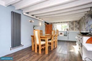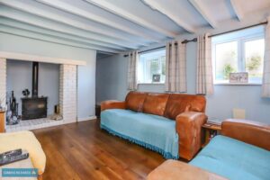 with feature inglenook fireplace with wood burner. Exposed ceiling beams.