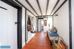 with exposed ceiling beams, understairs storage, stairs to first floor.