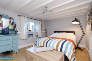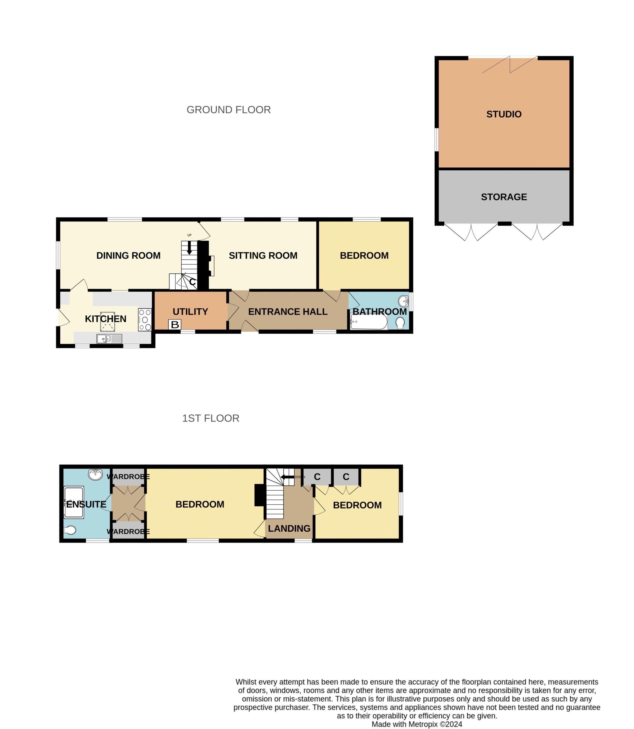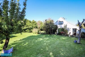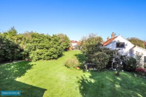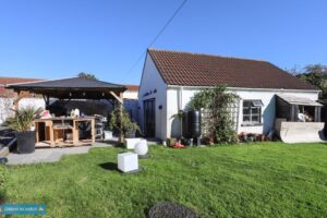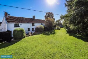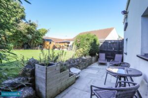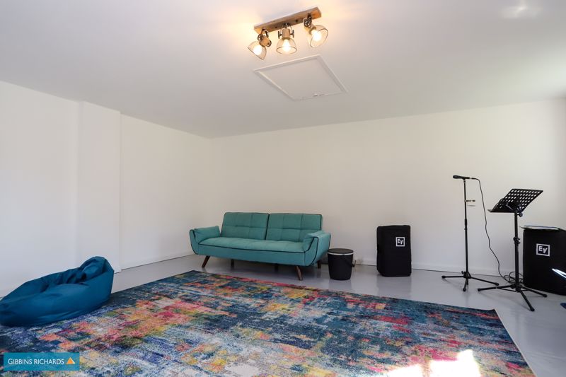 Partly walled front garden with extensive off road parking and access to Studio (former double garage) – 19′ 0” x 15′ 8” (5.79m x 4.77m) with power and lighting. The rear garden contains a raised sun terrace and gazebo, extensive lawned sections, storage sheds (one containing light and power). The garden itself is well screened by mature shrubs and hedgerows.