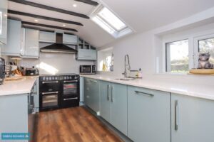 Fitted with floor and wall cupboard units, granite work tops, ‘Range’ electric oven. Access to garden.
