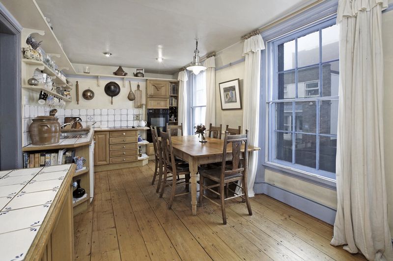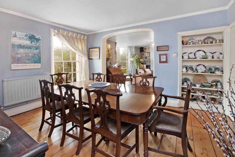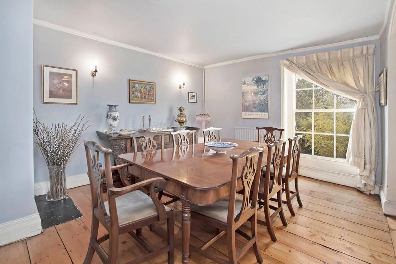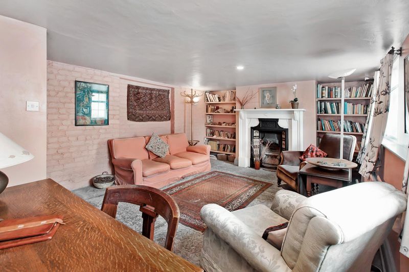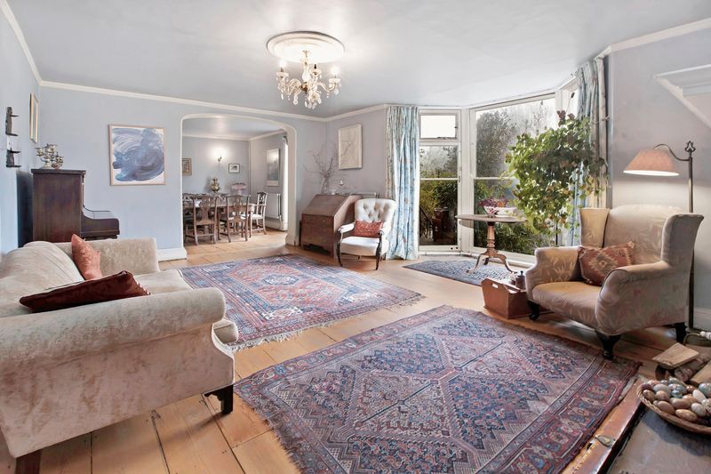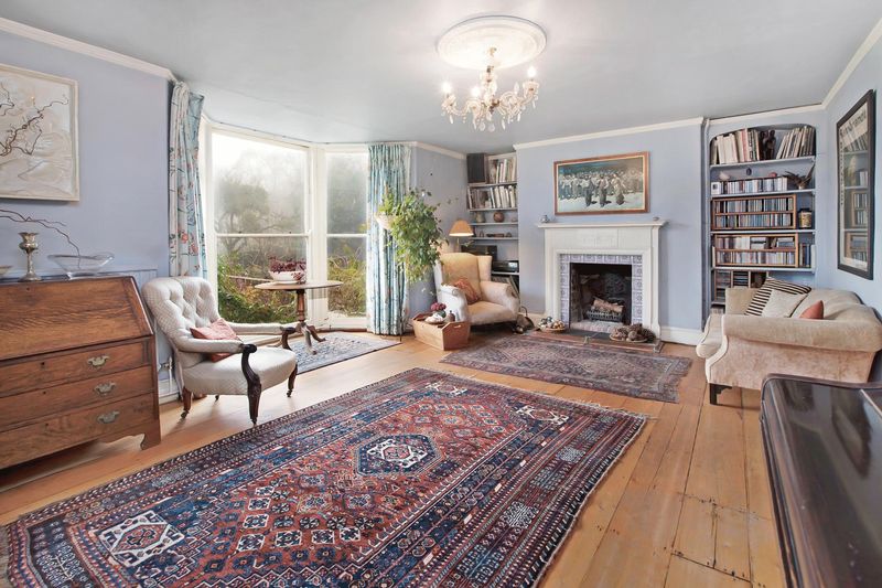 The bay window has a glazed door which opens onto a small balcony with metal steps descending into the charming gardens. This room enjoys a superb view over the garden to Vivary Park and contains the an original and working open fireplace and exposed floorboards. An original archway then opens to the: