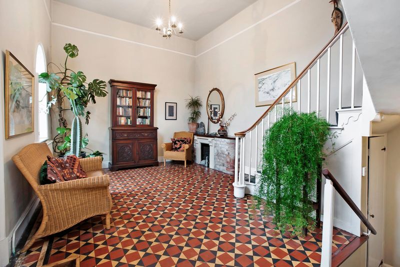Original flagstone floor, original cast iron open fireplace, built-in book shelving.