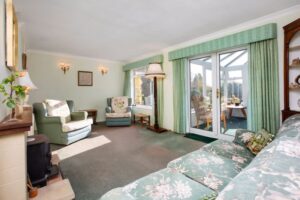 Tiled fireplace with multi fuel burner. Double glazed French doors to:
